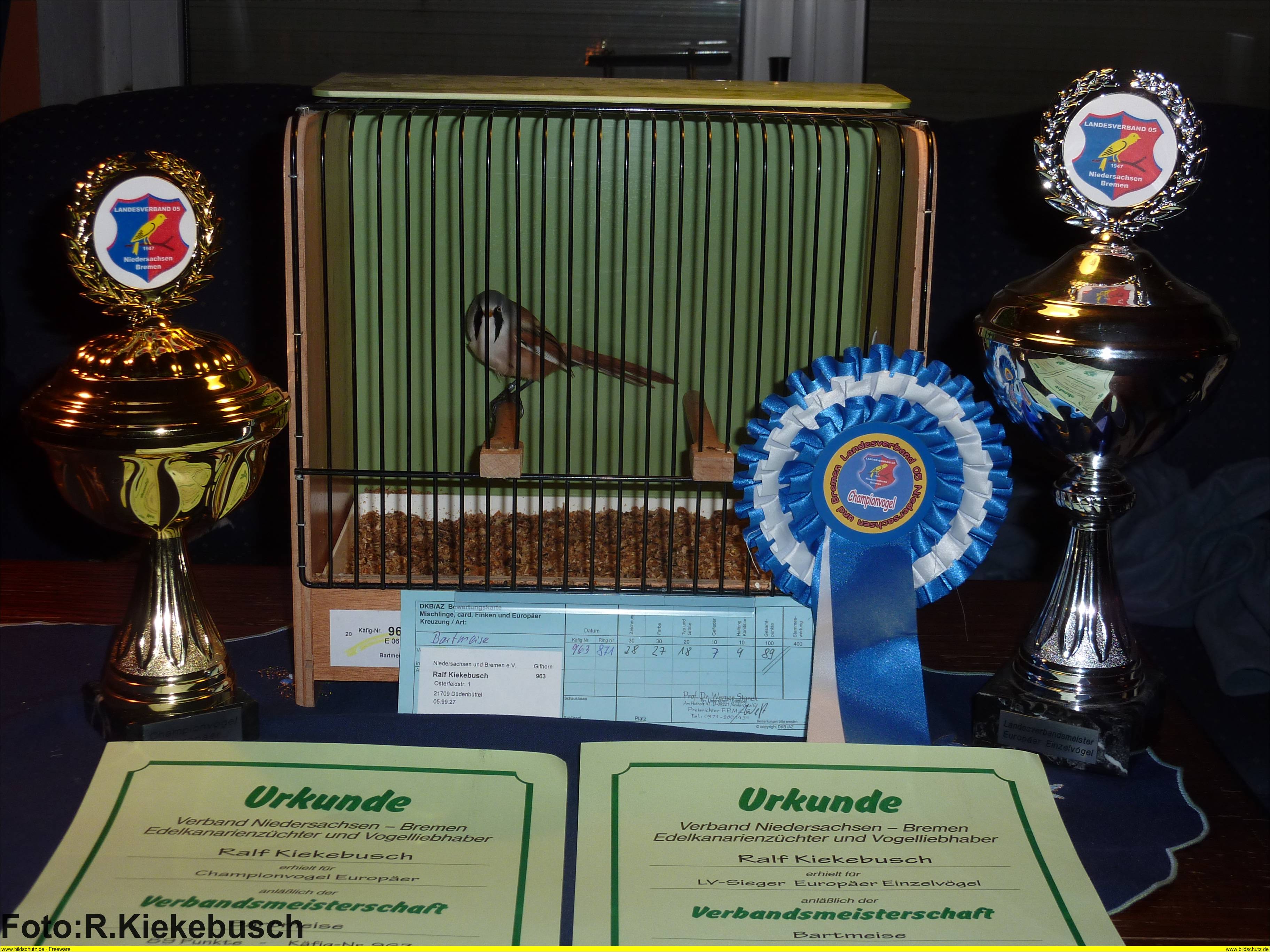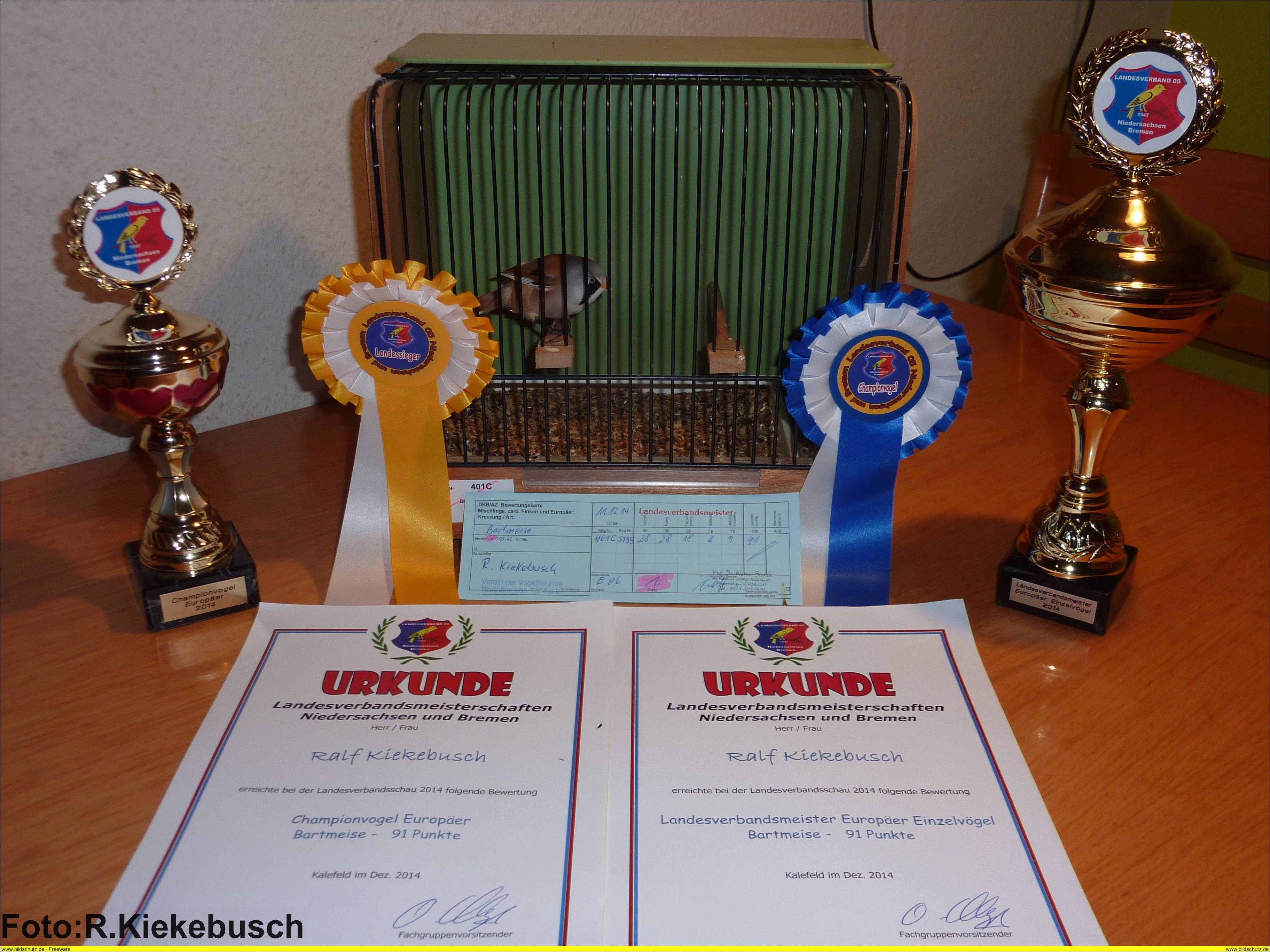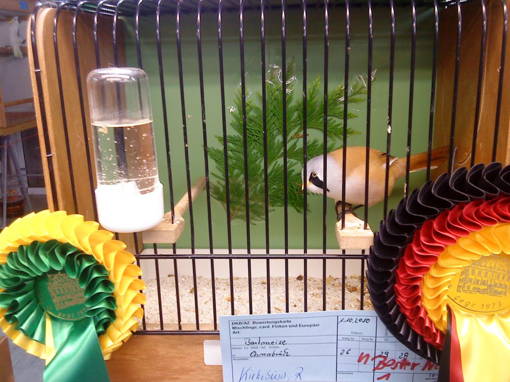 | Auszeichnung 2014: "DKB Landesverbandsmeister und Championvogel 2014" mit einer Bartmeise |